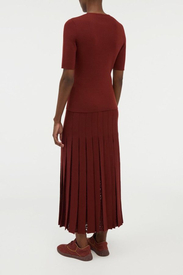 the Debutante Skirt is slim through the hips with dramatic pleats in the skirt. Inside each pleat is a pointelle pattern that gives an airy transparency throughout the skirt as it moves.