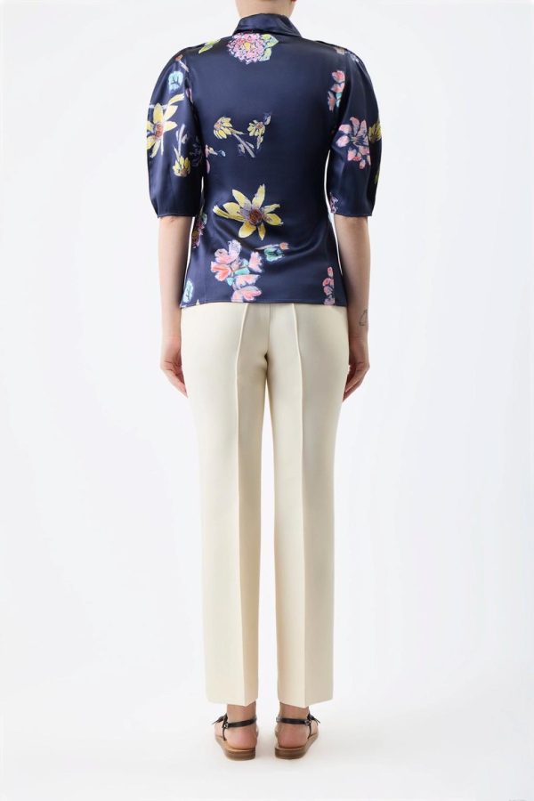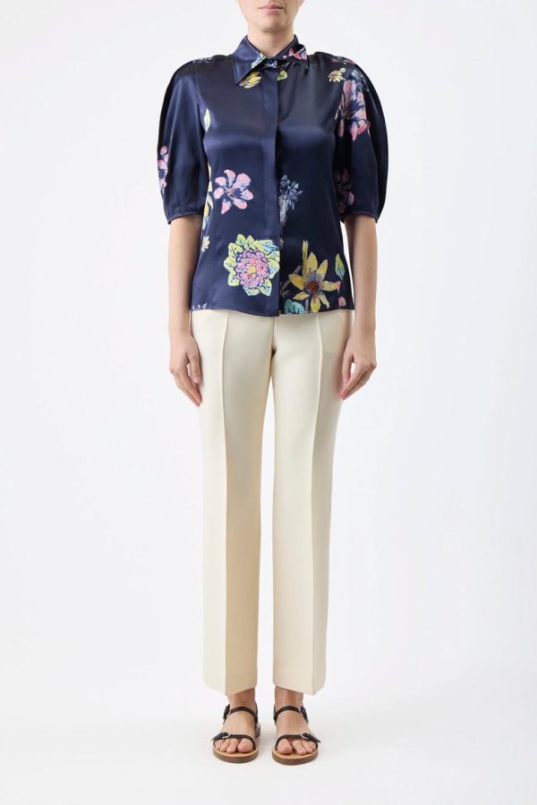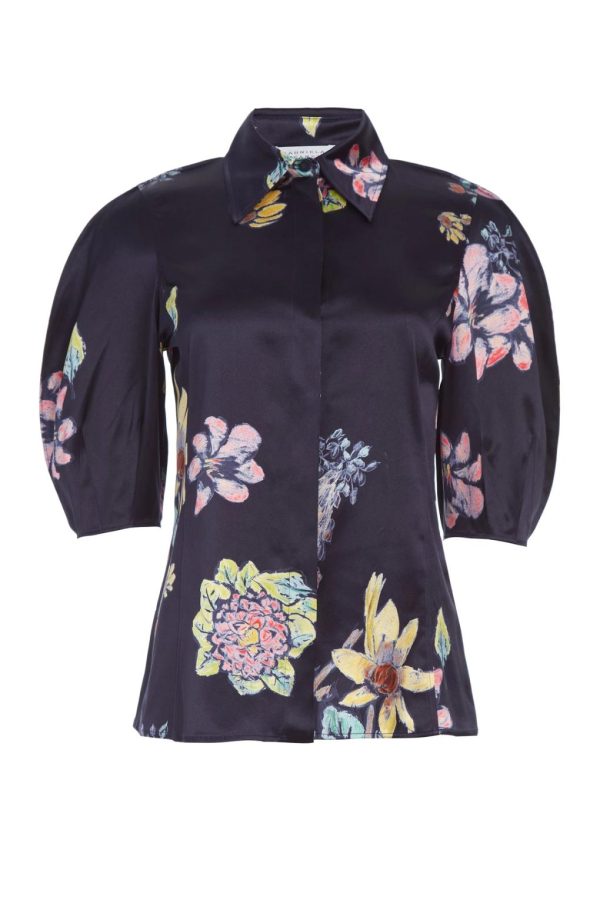 combining a classic button-down silhouette with sculptural full sleeves that finish at the elbow. The print features original artwork by Gabriela’s friend